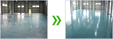 工場や倉庫の耐水及び耐久性を目的とした防塵材や、食品作業室や厨房等衛生上必要な塗り床工事等幅広い用途で使用される床工事も防水工事の分野です。